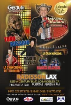 Miami, FL, miércoles, 6 de julio del 2011.- (F & F Media Corp.) Toño Rosario, La Gran Manzana, Aniceto Molina, Marito Rivera, Banda Blanca y La Chanchona de Tito Mira conforman la exquisita cartelera que invadirá a la ciudad de Los Ángeles el próximo fin de semana.